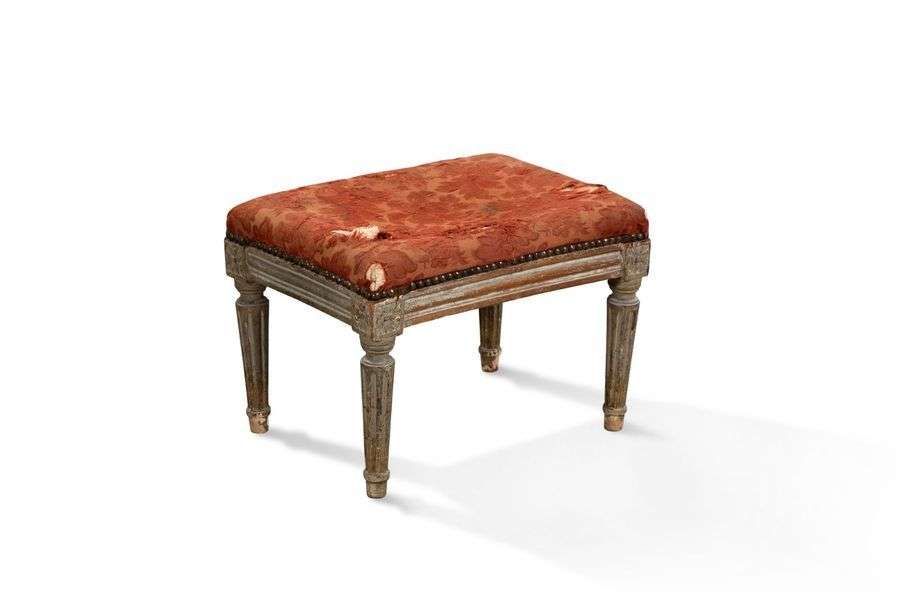 ø TABOURET DE PIED en bois mouluré sculpté et laqué gris reposant sur quatre pieds fuselés cannelés. Epoque Louis XVI