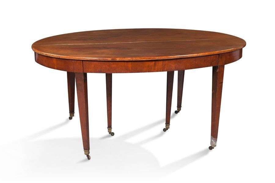 ø TABLE OVALE en acajou et placage d'acajou. Elle repose sur six pieds gaine terminés par des sabots de bronze à roulettes. XIXe siècle