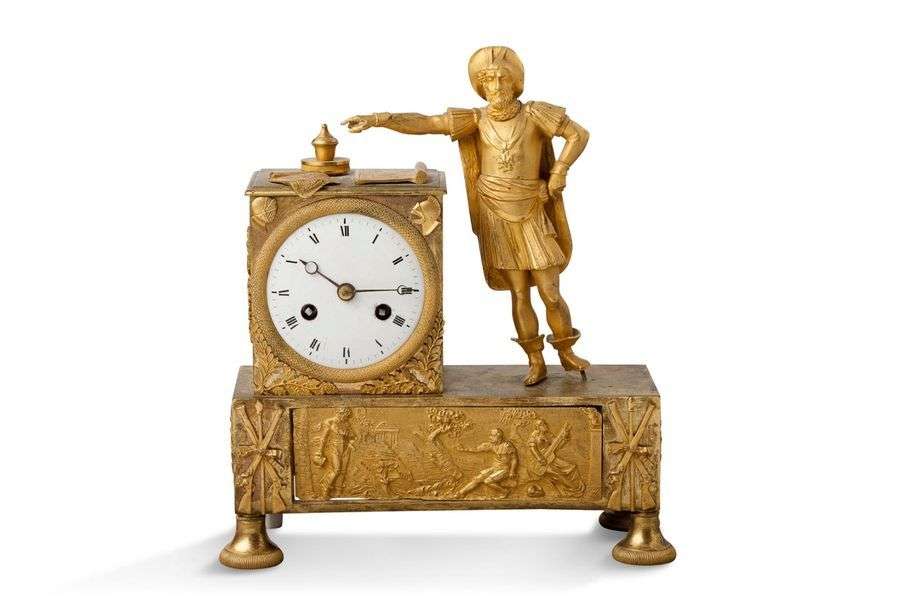 PETITE PENDULETTE en bronze ciselé doré représentant Henri IV en conquête. Elle repose sur une base rectangulaire ornée d'une frise flanquée de motifs au fusil. Époque Restauration