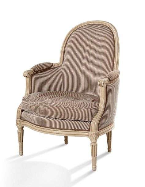 BERGÈRE en bois naturel mouluré sculpté et laqué crème à décor de nervures. Ceinture réunie par des dés de raccordement à rosace, elle repose sur quatre pieds fuselés à cannelures rudentées. Epoque Louis XVI