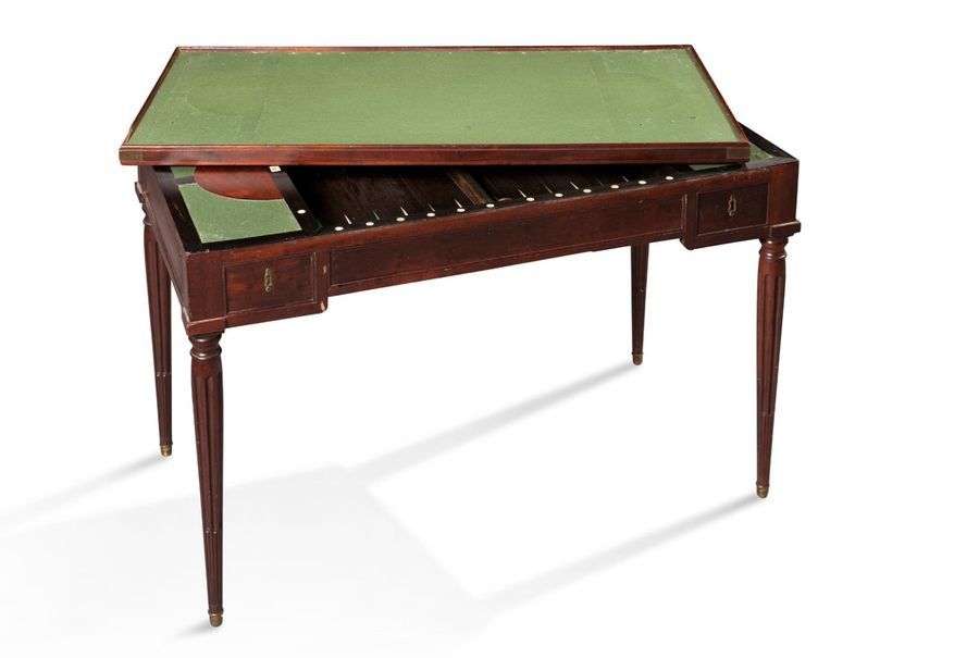 TABLE À JEUX DE TRIC TRAC en acajou, le plateau découvre la surface de jeu marquetée. Elle repose sur quatre pieds cannelés. Style Louis XVI.