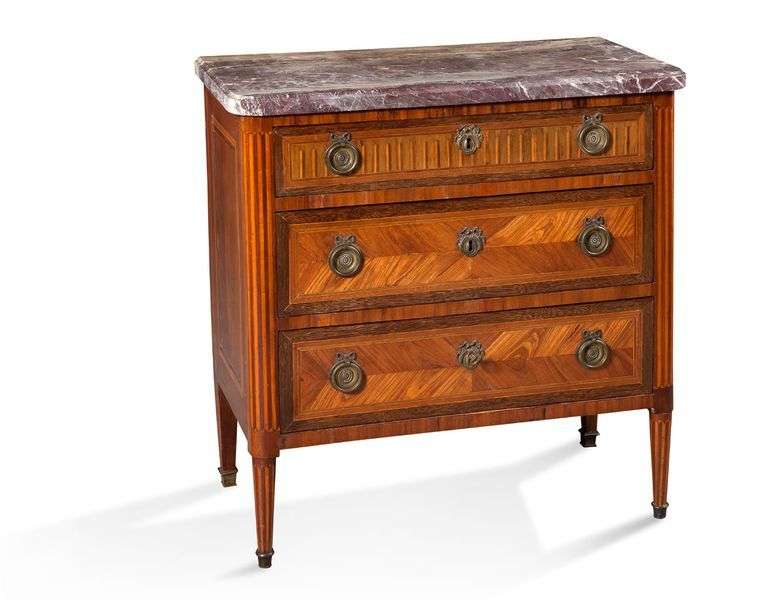 PETITE COMMODE en marqueterie de bois divers ouvrant en façade par trois tiroirs. Montants arrondis à cannelures feintes reposant sur quatre pieds fuselés. Fin de l'époque Louis XVI, travail provincial Plateau de marbre gris veiné H: 83,5 - L: 82 - P: 45 cm Fentes, soulèvements