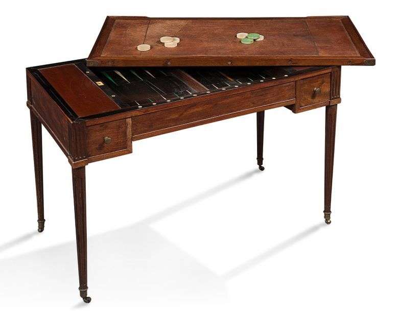 TABLE TRIC TRAC en placage d'acajou. Le plateau gainé de cuir marron doré aux petits fers découvre le jeu de tric-trac en marqueterie de bois teinté. Elle repose sur quatre pieds fuselés cannelés terminés par des roulettes Fin de l'époque Louis XVI Traces d'estampille J . ? H: 75 - L: 112,5 - P: 59 cm Manques