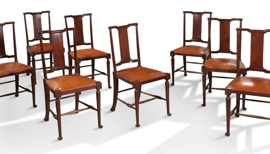 PAIRE DE FAUTEUILS ET HUIT CHAISES en acajou massif mouluré reposant sur un piètement réuni par quatre barres d'entretoise. Travail anglais du XIXe siècle. Galette en cuir cognac. Fauteuil: H: 105 - L: 55 - P: 52 cm Chaise: H: 96,5 - L: 46,5 - P: 46 cm