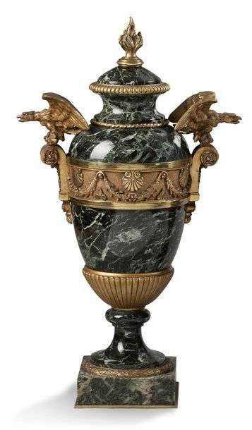 PAIRE D'URNES COUVERTES en marbre vert de mer et bronzes ciselés dorés à décor d'une frise de coquilles et de guirlandes de lauriers. Les anses formées d'aigles reposant sur des prises à enroulement feuillagé. Prise en forme de flamme Fin du XIXe