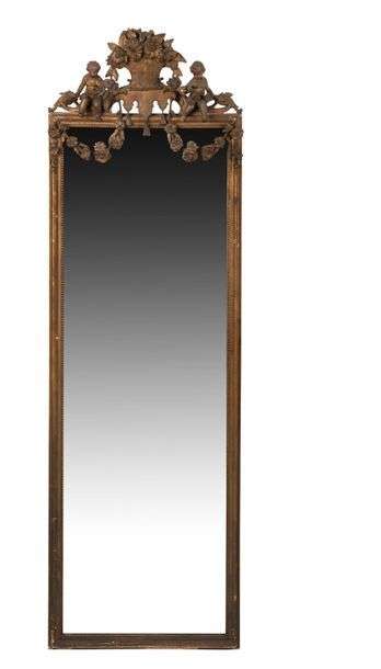 MIROIR en bois mouluré sculpté doré, le fronton orné d'un panier fleuri est flanqué d'angelots. XIXe siècle