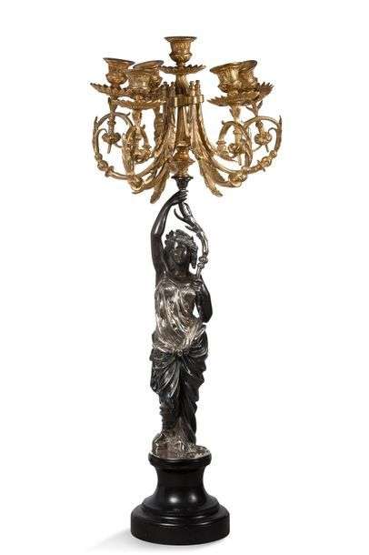 PAIRE DE GRANDS CANDÉLABRES à six bras de lumière en bronze ciselé doré, patiné et argenté portés par deux femmes drapées à l'antique et reposant sur un contresocle circulaire en marbre noir. XIXe siècle
