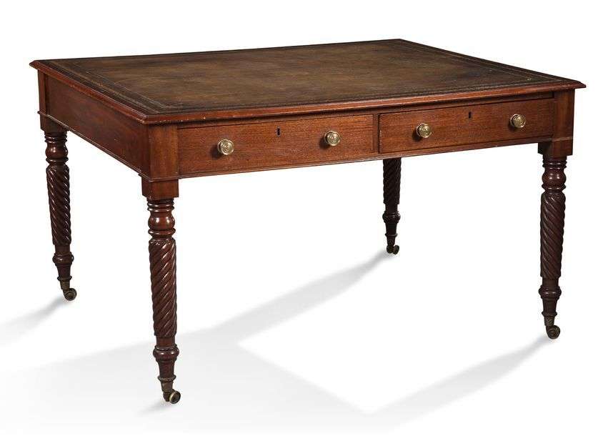 BUREAU DE FORME RECTANGULAIRE en acajou et placage d'acajou ouvrant en ceinture par quatre tiroirs. Il repose sur quatre pieds torsadés terminés par des roulettes. Poignées de tirage en laiton ciselé et plateau de marbre gainé de cuir vert doré aux petits fers. Collection Andrée Higgins Travail anglais fin du XIXe siècle