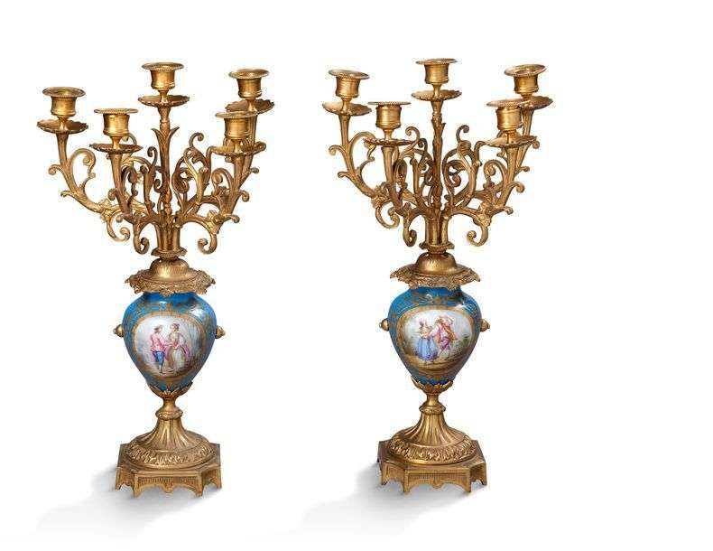 PAIRE DE CANDÉLABRES en bronze ciselé et doré à cinq bras de lumière. Le fût balustre en porcelaine bleue présente un décor de scènes galantes et de paysages dans des médaillons.