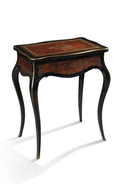 ø TABLE NAPOLEON III en bois noirci, bois moucheté et incrustion de nacre reposant sur quatre pieds cambrés. Le plateau ouvre et découvre un casier.