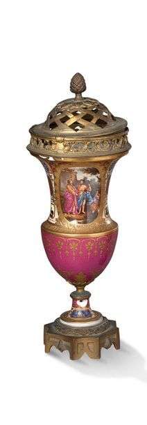 PAIRE DE VASES COUVERTS en porcelaine polychrome et or à décor de personnages bibliques et de paysages dans des médaillons. Monture en bronze ciselé doré. Vienne, XIXe siècle.