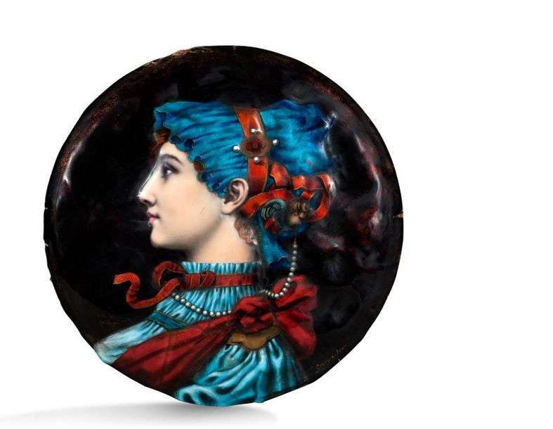 IMPORTANT MÉDAILLON en cuivre émaillé polychrome représentant une femme de