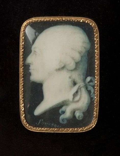 Petit portrait miniature de profil en émail de Richard Mique dans un encadrement en bois doré. Signé