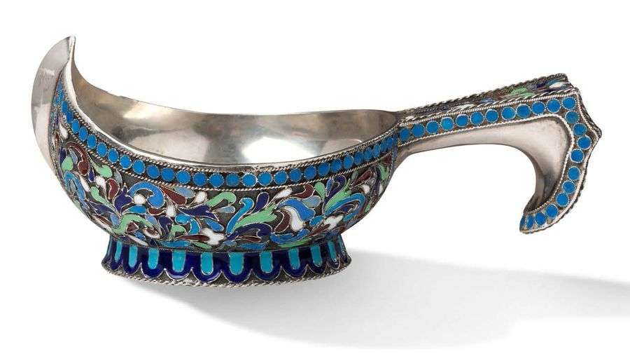 KOVCH en argent et émaux polychromes cloisonnés à décor d'arabesques et fe