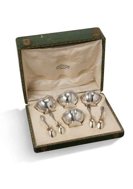 COFFRET comprenant quatre petits salerons en argent et vermeil ornés de fr