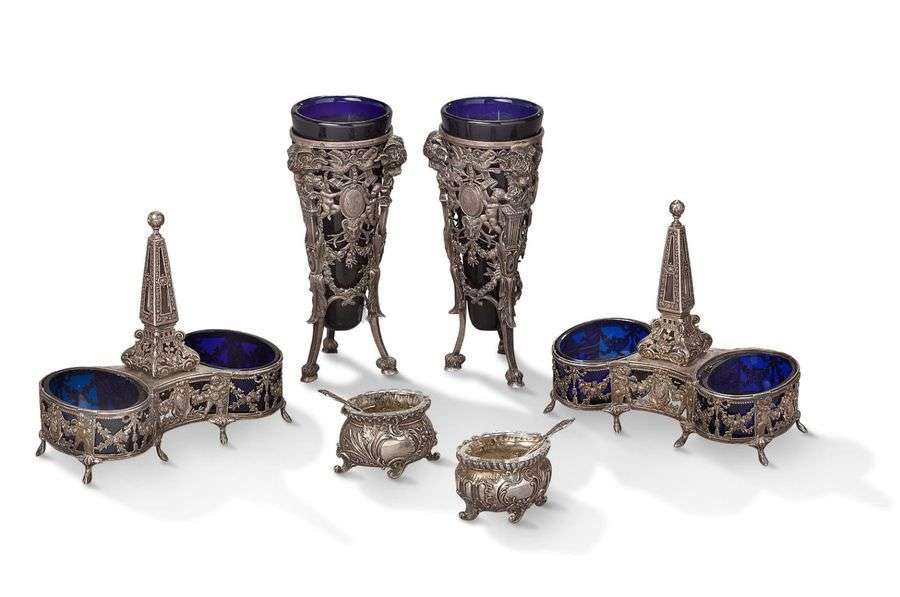 ENSEMBLE comprenant: Maison L. Llapar Paris deux coupes côniques en métal argenté chiffré et ciselé de têtes de boucs et de putti. Doublures en verre bleu. Une paire de salerons en argent doublures en verre bleu à décor de putti et de guirlandes fleuries. Poinçon Minerve On joint une paire de salerons et leurs petites cuillères en argent. Poinçon Minerve.