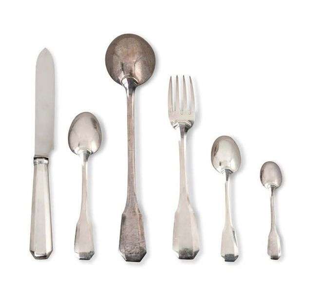 PARTIE DE MÉNAGÈRE en argent, modèle Art Déco, comprenant: Six petits couverts (manque une fourchette) Six grands couverts Un couvert à salade Six cuillères à café Six cuillères à moka Poinçon minerve. Poinçon d'orfèvre: E C