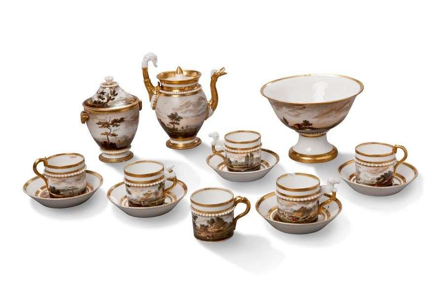 PARTIE DE SERVICE en porcelaine à fond or et à décor polychrome de paysage, les anses formées d'animaux stylisés et les cols réhaussés de rangs de perles. Comprenant: une théière, un sucrier, une coupe, six tasses et cinq sous-tasses. Paris, XIXe siècle