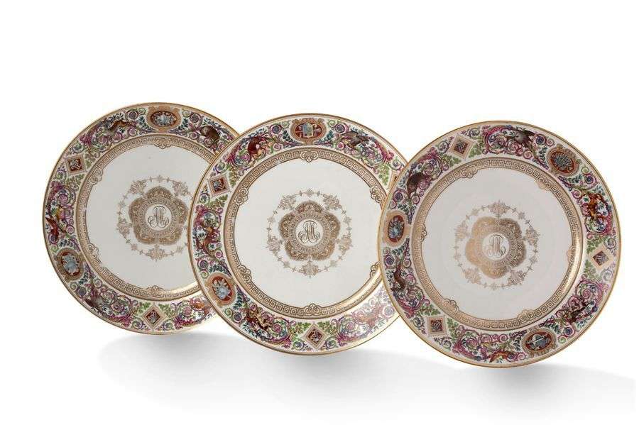 Trois assiettes à décor postérieur. Imitation du service de chasse de Louis Philippe. Filet or sur les bords, marque apocryphe du château de P. Bleau.