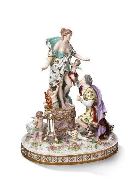 GROUPE en porcelaine à fond blanc à décor or et polychrome représentant une scène galante. XIXe siècle, Meissen