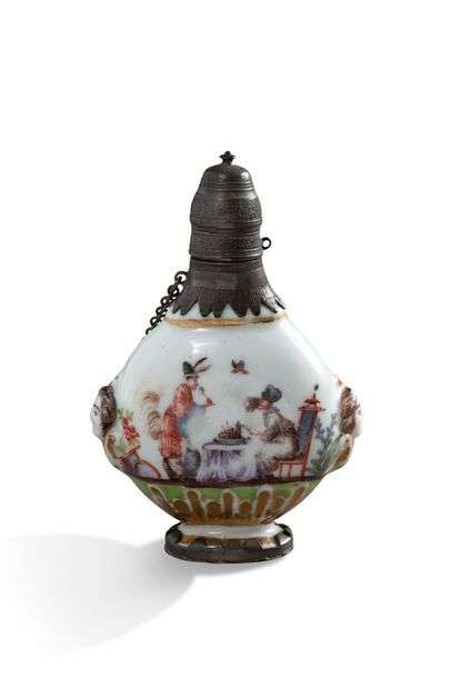 FLACON MEISSEN XVIIIE SIÈCLE en porcelaine à fond blanc à décor polychrome d'une scène animée. Monture argent