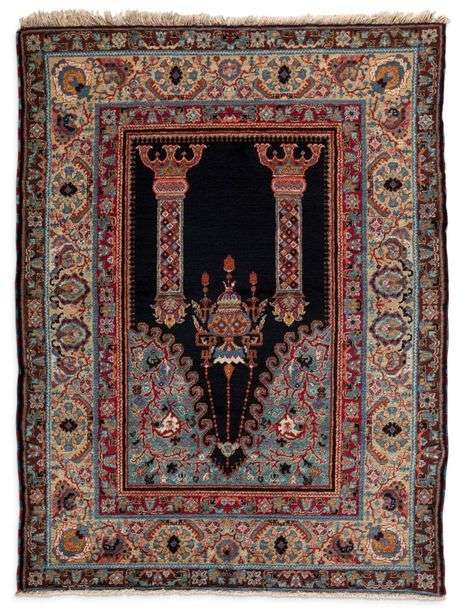 ø TABRIZ (NORD DE L'IRAN), MILIEU DU XXE SIÈCLE Tapis de forme prière Velours en laine Champ bleu marine a mihrab de prière stylisé , deux colonnettes et lampe à huile suspendue. Triple bordures dont la principale ivoire dite « El maleh » 167 x 130 cm