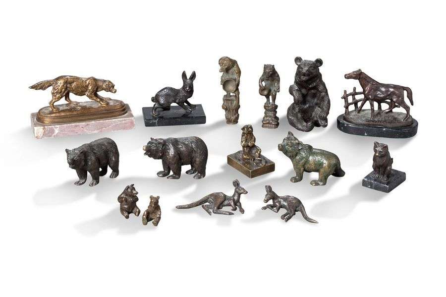 ENSEMBLE DE QUATORZE PETITES SCULPTURES ANIMALIÈRES en bronze patiné et un