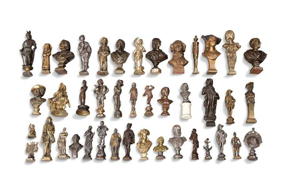ENSEMBLE DE QUANRANTE-DEUX CACHETS ET STATUETTES en bronze ciselé patiné argenté ou doré représentant des personnages historiques (portrait de Napoléon, Robespierre, Henri IV...) XIXe siècle