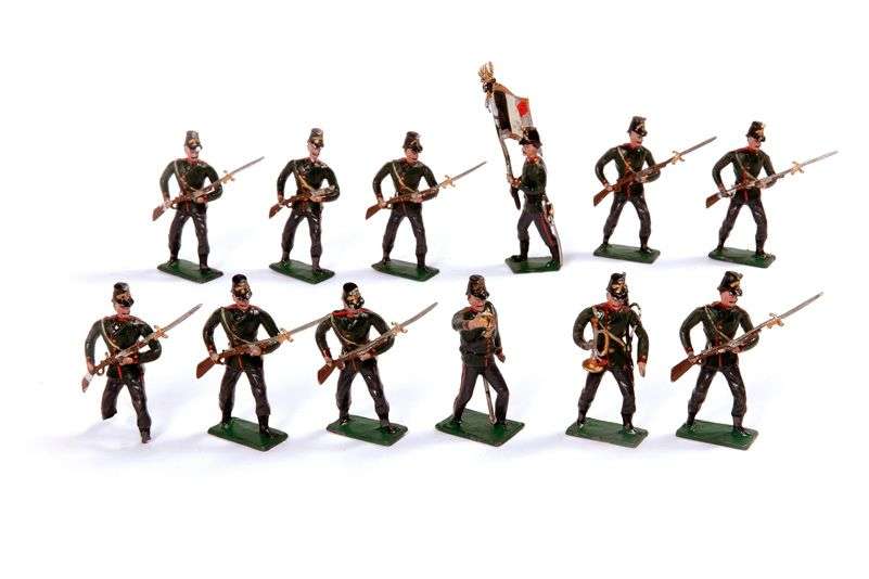 Douze prussiens à la charge avec officier, porte drapeau et tambour.