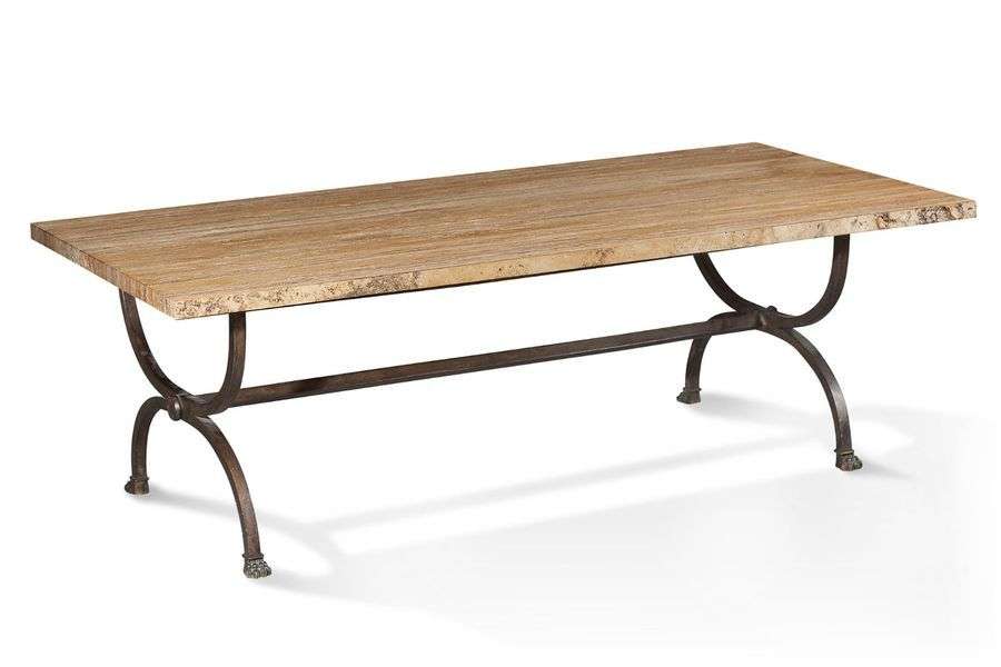 TABLE BASSE en métal patiné. Le piètement de forme curule repose sur quatre pieds griffe. Plateau de marbre jaune. XXe siècle