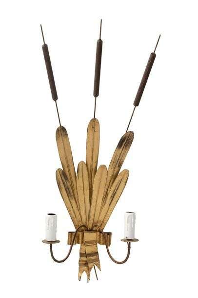 PAIRE D'APPLIQUES à deux bras de lumière en métal doré découpé formant des tiges de roseaux réunies par un noeud rubanné. XXe siècle