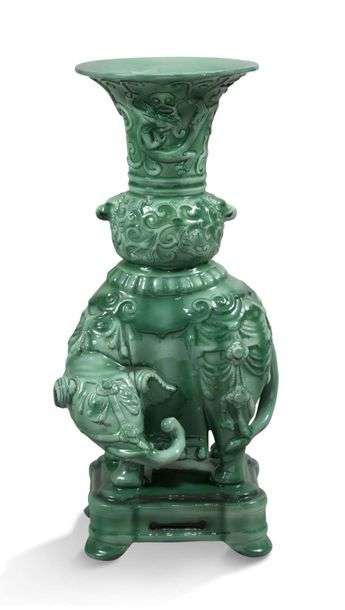 Rare et exceptionnelle paire de vases à panse bombée et col évasé en céramique émaillée turquoise présentant un décor en léger relief de motifs floraux, d'éléphants et de dragons reposant sur une base ajourée quadrangulaire à bords arrondis se terminant sur quatre pieds évasés. Signés «TH.Deck» sous la base Vers 1880-1890