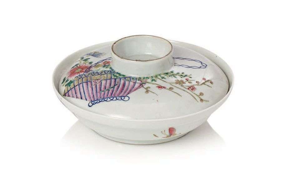 Coupe couverte en porcelaine et émaux de la famille rose à décor de panier fleuri et papillons. Le couvercle formant également en coupe avec marques sur la base et le couvercle: Qinghua Zhenpin, qui veut dire