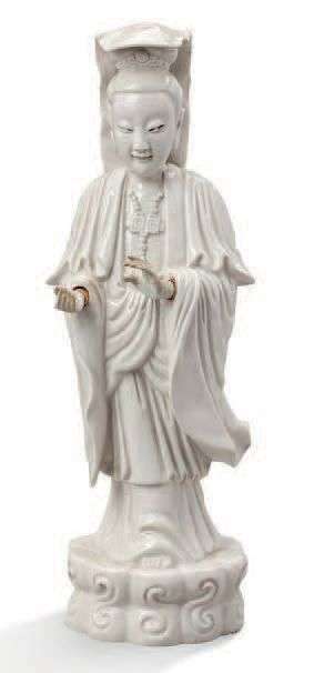 Divinité féminine en porcelaine blanc de Chine debout sur un socle floriforme tenant dans l'une de ses mains le joyau de la sagesse.