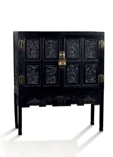 Grand cabinet en bois de fer ouvrant à deux portes à décor de huit panneaux sculptés de divinités. Tiroir caché sur le bas du meuble.