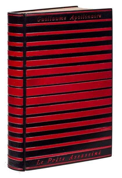 In-8, plein veau noir décoré de listels horizontaux de différentes largeurs en veau verni garance, dos lisse orné de même, titre et nom de l'auteur entre les bandes à l'oeser rouge sur le premier plat, doublure et gardes de daim rouge bordées de box gris, tranche dorée sur témoin, couverture illustrée et dos conservés, chemise demi-veau noir à rabat et étui (Reliure C et J.-P. Miguet, 1996).