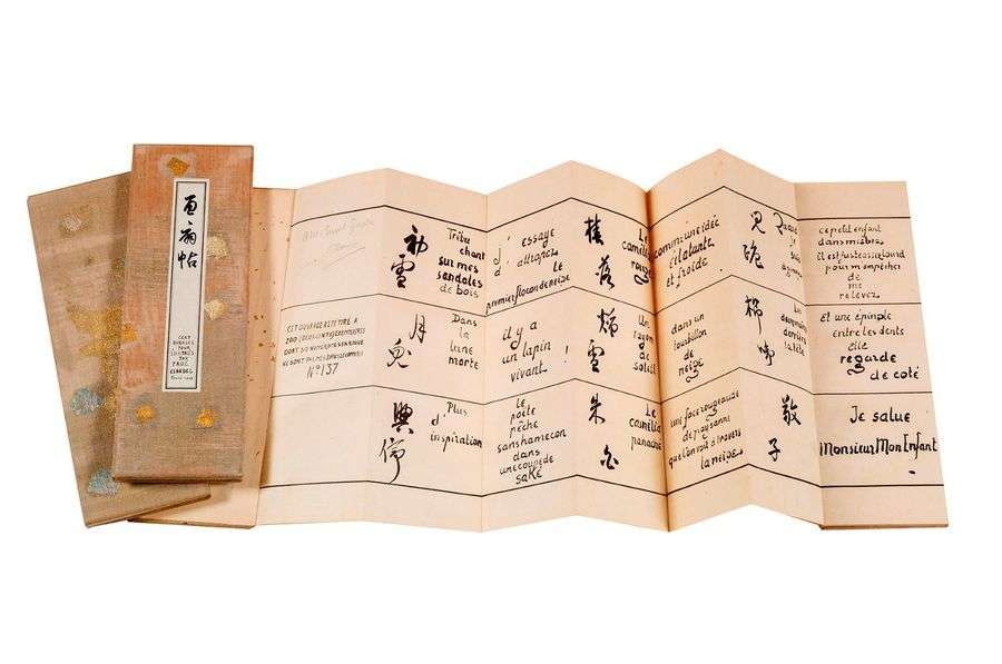E n t i è rement lithographié d'après le manuscrit de l'auteur par Koshiba. Tirage à200 exemplaires sur papier Senga. La page, divisée en 3 horizontalement, présente des caractères japonais et les haïkus de Claudel. Les 172 phrases sont aussi calligraphiées par le poète lui-même et les idéogrammes sont choisis par Yamanouchi et Yoshié et tracés par Ikuma Arishima.