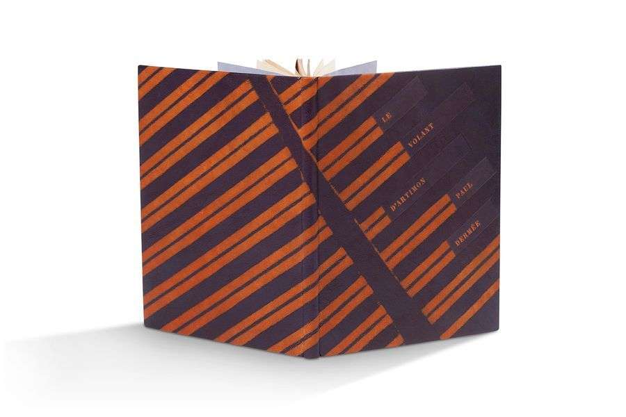 In-8, chagrin brun mosaïqué de bandes orange aux plats et au dos, auteur et titre orange insérés dans des cartouches de chagrin brun au premier plat, dos long, doublure et gardes de daim parme, couverture et dos conservés, chemise demi-chagrin brun, étui (Reliure Alain Devauchelle).
