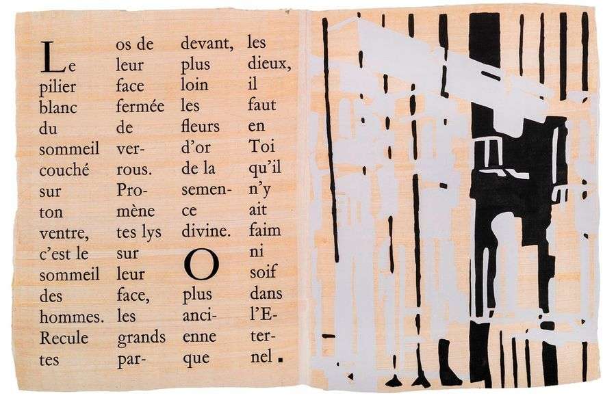 Édition originale sur papyrus d'Égypte, illustrée de 16 pochoirs originaux de François Rouan dont la couverture en parchemin. Tirage limité à 40 exemplaires signés par le poète et l'artiste (n°18).