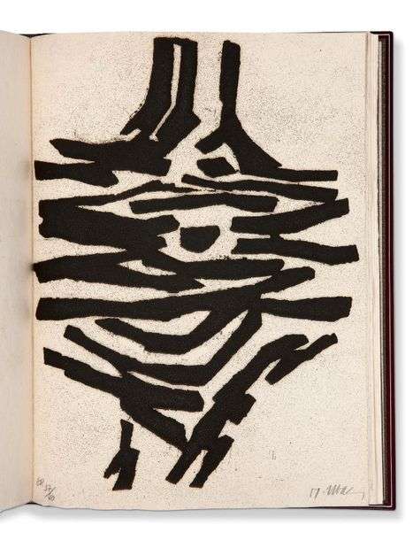In-folio, box bordeaux orné sur chaque plat de découpes abstraites de liège dans des teintes claires et foncées, dos lisse, filet poussé au palladium sur les coupes, couverture rempliée, sous emboîtage (Reliure Devauchelle).