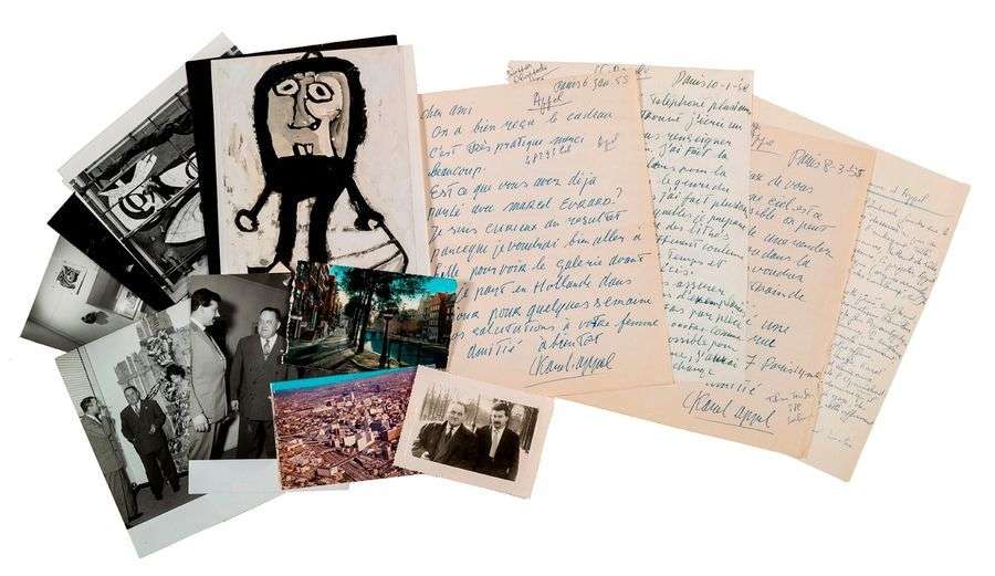 - 10 photographies d'archives: exposition Appel à la Galerie Claude Bernard, Michel Tapié et Appel, ou représentant ses oeuvres.