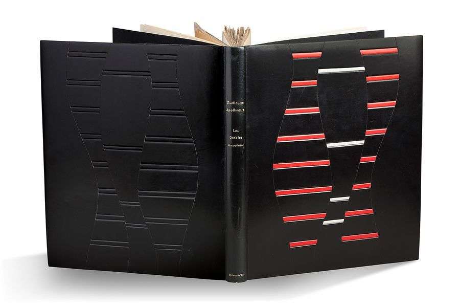 In-4, 34 feuillets de formats divers montés sur onglets dont 40 entièrement autographes et 58 d'une autre main (Jean Mollet ou Maurice Tourneux). Box noir signé de Honegger (1990), premier plat avec incrustation de bandes de box rouge et ivoire, disposées en ondulations verticales, même décor à froid sur le second plat, dos lisse, titre doré, gardes de daim noir, tête dorée sur témoins, étui.