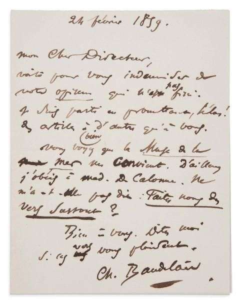 A Alphonse de Calonne, directeur de la revue Contemporaine pour laquelle Baudelaire écrivit plusieurs articles. Baudelaire évoque ses retards à rédiger «Opium» et faisant allusion à la création de son chef d'oeuvre L'Albatros. Voilà pour vous indemniser de votre Opium qui n'est pas fini, je suis parti en promettant, hélas ! des articles à d'autres qu'à vous (...). Vous voyez bien que la Muse de la mer me convient. D'ailleurs j'obéis à Mad. de Calonne. Ne m'a-t-elle pas dit: Faites nous des vers surtout ? (...)