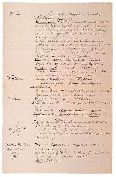 Importantes notes préparatoires, illustrées par des croquis et des tableaux en marge du texte, concernant un des sujets des prédilection du savant: le magnétisme