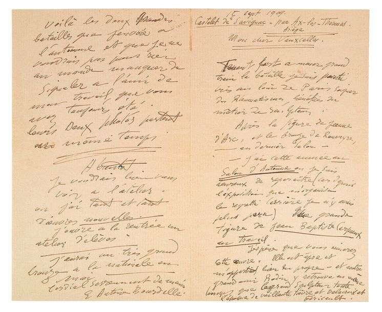 Présentation de ses travaux, oeuvres qu'il exposera au Salon d'Automne. Tenant fort à mener grand train la bataille, je suis parti très au loin de Paris soigner des rhumatismes, bénéfices du métier de sculpteur. Après la figure de Jeanne d'Arc, et le bronze de Rouveyre, - au dernier salon - j'ai cette année au Salon d'Automne où je suis heureux de reparaître (...) une grande figure de Jean-Baptiste Carpeaux au travail. J'espère de vous aimerez cette oeuvre (...) et notre grand ami Rodin y retrouve en même temps que le grand sculpteur toute l'époque de vaillante fièvre et Delacroix et Géricault. J'entame là un grand Courbet. Il n'y a pas dans toute cette figure un plan éclairé par le hasard, toutes les ombres sont menées, toutes les faces lumineuses voulues, c'est l'architecture des étoffes et du corps, et des gestes humains amalgamée à la vie brûlante observée et la fonte du tout dans l'austère, dans l'uniquement belle tradition romane et gothique de notre grande antique France (...). Tout ce qui ne coule pas de la race, tout l'art canaque, roublard arriviste et bâclé dont tant de boutiquiers nous innondent pour un jour, tout cela sèchera. Mais je m'emballe et je prêche un converti (...). Il enverra un autre portrait de carpeau en buste de la collection Doucet... Voilà les deux grandes batailles que j'envoie à l'automne et que je ne voudrais pas pour rien au monde manquer de signaler à l'ami de mon travail (...). Il souhaite le voir prochainement à son atelier où il a plusieurs oeuvres nouvelles à lui montrer et où il ouvrira à la rentrée un atelier d'élèves