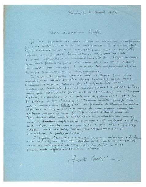 A propos des exemplaires pour Gaffé, du Manifeste du surréalisme et de Poisson soluble. Breton s'inquiète du silence de son correspondant malgré son télégramme et sa lettre. (...) Connaissant votre ponctualité, j'avais naturellement compté recevoir un chèque de vous aux tout premiers jours du mois et j'en avais disposé en partie par avance. Je vais être très embarrassé si je ne le reçois pas demain ou après-demain. Il est allé voir jeudi dernier le relieur Bonet qui lui a exécuté «l'impressionnante reliure du Manifeste». Il serait rudement désirable que ces oeuvres fussent exposées à Paris, voilà qui secouerait pas mal de routines. J'ai vivement déploré, en feuilletant le volume, d'y trouver en plus de la Préface et des chapitres de «Poisson soluble» que je vous avais remis, une copie par ma femme de plusieurs autres chapitres. Il n'ay a pas un mot de ma main dans ces quelques pages. Je crois qu'il faudrait à tout prix les faire disparaitre, quitte à garder un centimètre de marge (...). Il demande ce qu'il pense de l'ouvrage avant d'enrichir son exemplaire de quelques notes, et ajoute: j'espère qu'aucun événement fâcheux n'est à l'origine de votre silence (...)