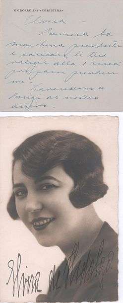 Billet de la jeune Callas à la soprano Elvira de Hidalgo, dont elle fut longtemps l'élève| elle prendra en voiture ses bagages dans la salle d'attente| elles se laveront à leur arrivée à Paris. Joint un portrait en photo-carte, dédicacée de Elvira de Hidalgo.