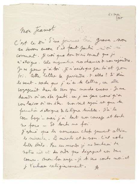 L.A.S. d'une étoile à son Jeannot (Jean Marais). S.l., 21 mai 1940. 1 pp. in-4| légt froissée.