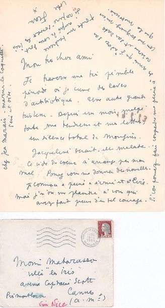 Émouvante lettre de Cocteau, malade, quelques mois avant son décès| il est à Marne-la- Coquette chez Jean Marais. Je traverse une très pénible période où je cuve des laves d'antibiotiques. Une autre grande tristesse. Depuis un mois malgré toute ma tendresse et mes lettres, un silence total de Mougins (...) Ce vide du coeur n'arrange pas mon mal (...). Je commence à peine à écrire et à lire, mais je n'ose me plaindre à vous qui avez fait preuve d'un tel courage (...). Il ajoute en p.s. au verso: La dernière nuit que j'ai parlé à Picasso, j'étais encore dans le coma, ne l'a-t-il pas compris ? C'était au Palais Royal