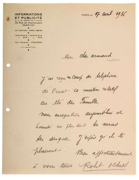 A propos d'enregistrement publicitaire. J'ai reçu un coup de téléphone de Privat ce matin relatif au Thé des Familles. Nous enregistrons aujourd'hui et lundi, au plus tard, tu auras les disques. J'espère qu'ils te plairont (...)